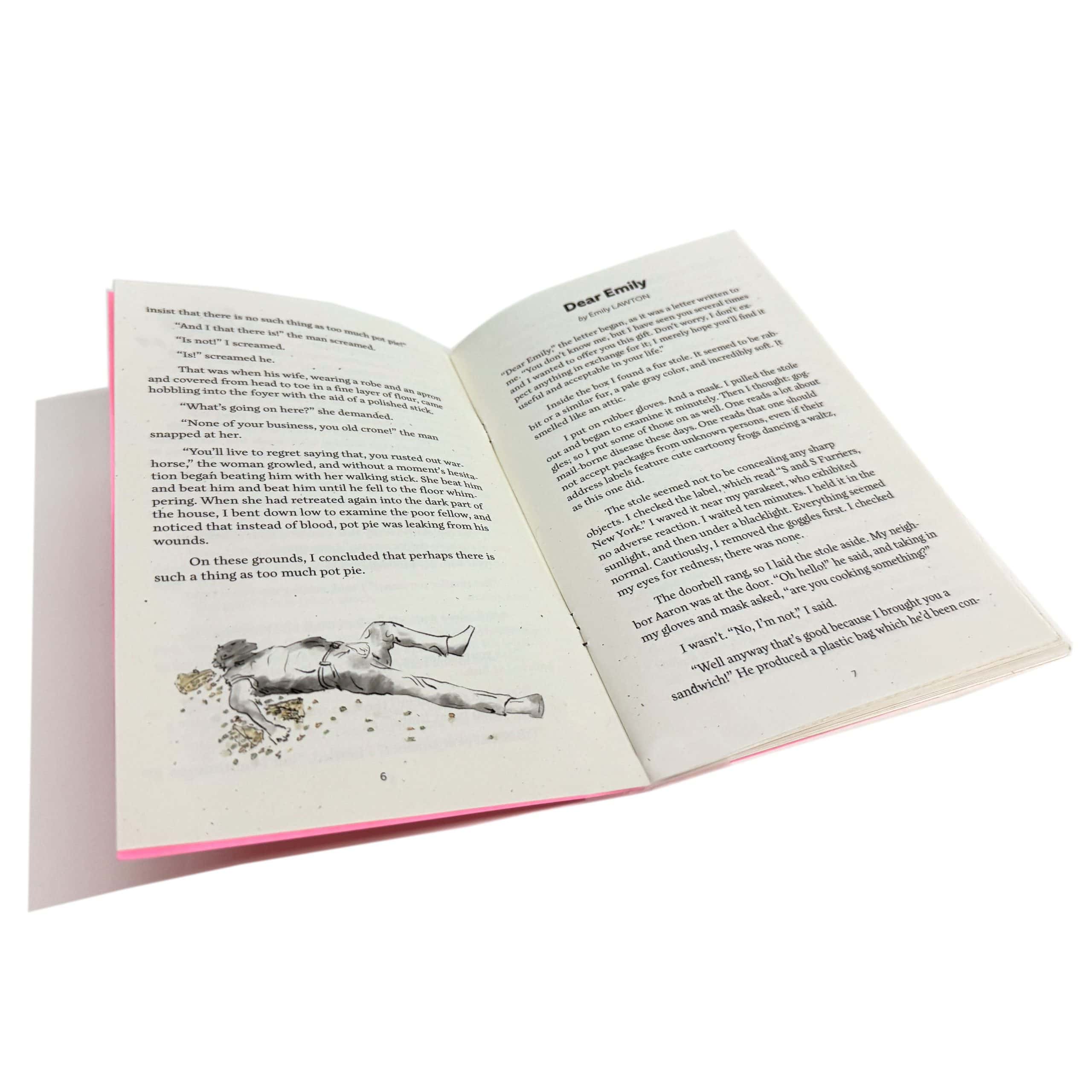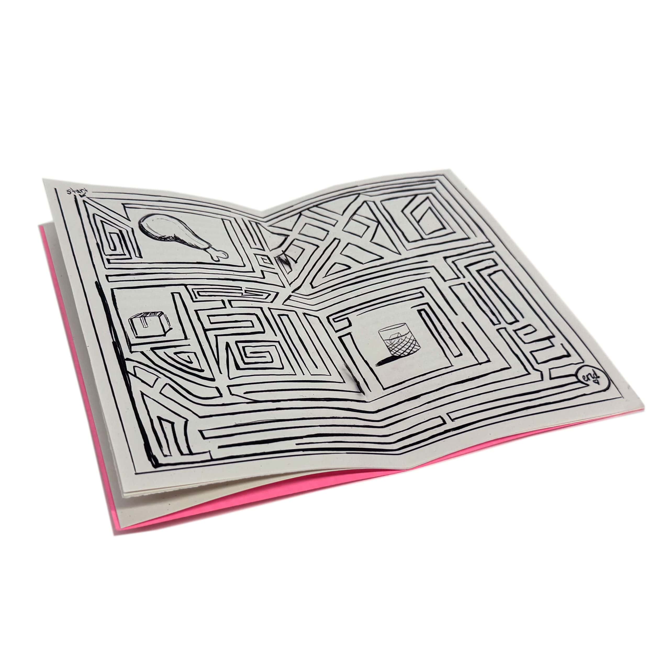 An epic adventure of bourbon, fried chicken, and a mysterious fur stole by Emily Lawton includes a maze at the zine’s centerfold. A bit of silliness about Jeff Koons by Derek Gray, an answer to the question can there be too much pot pie?, a story of love’s complexities by Robert Wexelblatt, and tales of unclaimed baggage and bar counter card tricks round out the fun.